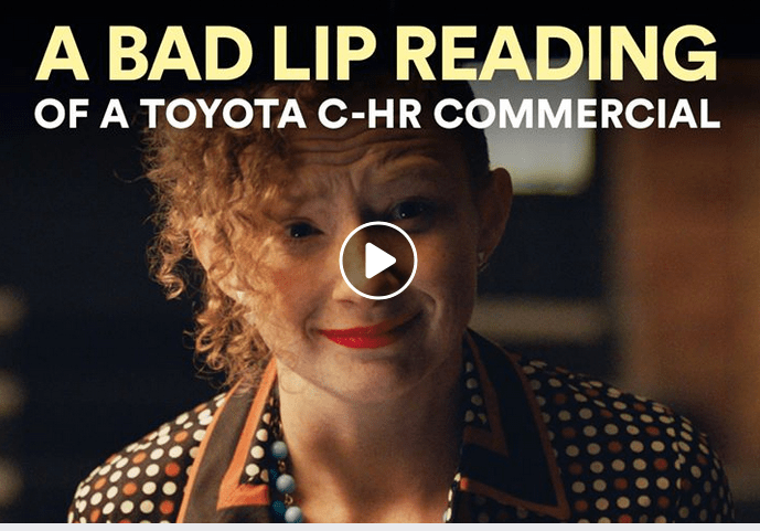 A Bad Lip Reading | Toyota Introducing A Bad Lip Reading of Charissa J. Adams in the Toyota | Cinderella Commercial! Save Save Share this: Click to share on Facebook (Opens in new window) Facebook Click to share on X (Opens in new window) X Click to email a link to a friend (Opens in new window) Email More Click to share on LinkedIn (Opens in new window) LinkedIn Click to share on Tumblr (Opens in new window) Tumblr Click to share on Pinterest (Opens in new window) Pinterest Related