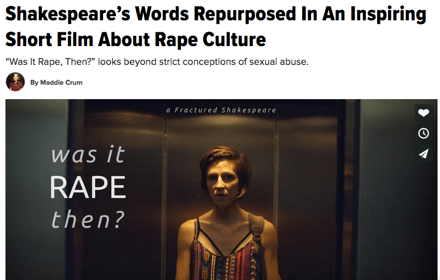 HuffPost Arts & Culture featured the newest Fractured Shakespeare short film, “Was it Rape, Then?” on their front page on June 7, 2107. The article, written by Madeline Crum, interviews producers Thaddeus Shafer and Kari Lee Cartwright on the making of the film. Check it out!